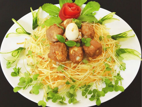 Bước 6: Cũng chảo chiên khoai ở trên, cho giò sống bọc trứng cút vào chiên chín với lửa vừa. Sau đó vớt ra bầy lên đĩa có lót lớp khoai tây chiên ở trên, trang trí với cà chua, dưa leo tỉa hoa và chút rau mầm là ta đã có được món giò sống bọc trứng cút chiên tạo hình tổ chim non sinh động cho bé yêu của bạn rồi.