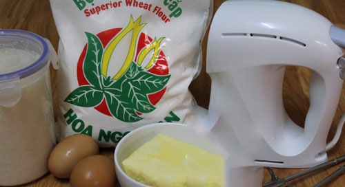 - Rắc bột mì vào đánh đến khi bột quyện đều.