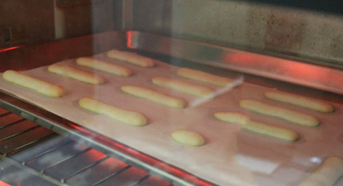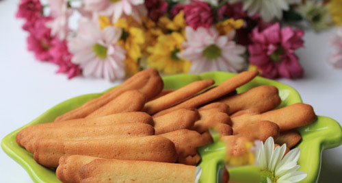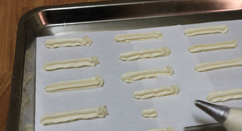 - Cho hỗn hợp bột vào túi bắt bông kem, lắp đui rồi bắt bánh ra khuôn đã lót giấy chống dính thành những đoạn dài khoảng 5 cm, cách nhau 2 cm. Nếu thấy bột hơi lỏng thì các bạn cho vào tủ lạnh khoảng 30 phút rồi đem ra bắt như bình thường.
