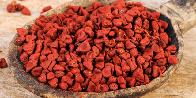 Màu hạt điều là màu đỏ, có thể dùng ở dạng nguyên hạt khô, nghiền thành bột chiết lấy dầu điều. Người ta thường dùng loại này để làm gia vị. Chất màu đỏ trong hạt điều tan trong chất béo, không tan trong nước, không độc, có cấu tạo hóa học là tiền vitamin A thường được dùng trong các món ăn xào, kho, quay để lấy màu đỏ đẹp mắt.
