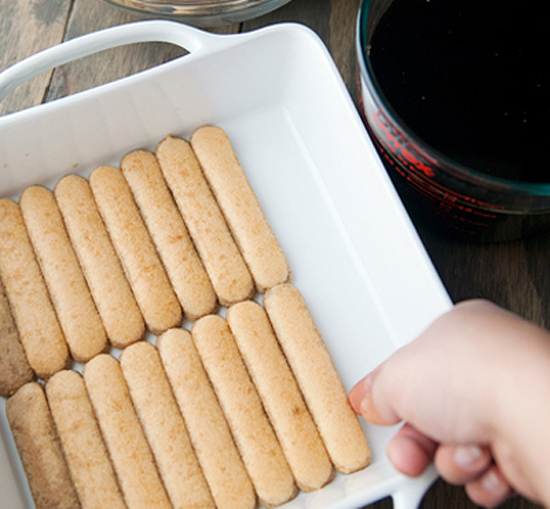 Bước 7: Bạn chuẩn bị sẵn bánh champagne, nhúng qua một lớp cà phê espresso rồi xếp ra khay.