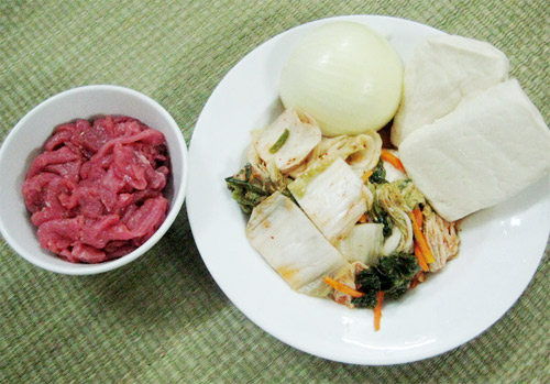 - Thịt bò rửa sạch thái miếng mỏng, to bản ướp với hạt nêm, dầu vừng. Kim chi cải thảo cắt khúc 3 cm. Đậu phụ rửa sạch trần qua nước sôi. Hành tây bóc vỏ bổ múi cau.