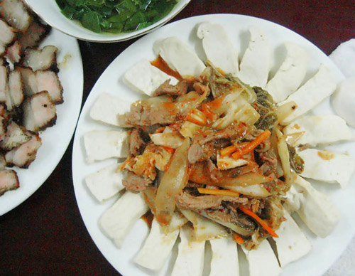 - Đậu phụ thái miếng dày 1 cm xếp ra đĩa thành hình hoa rồi trút hỗn hợp thịt bò xào vào giữa. Khi ăn gắp 1 miếng đậu phụ và 1 ít thịt bò xào kim chi ăn kèm.