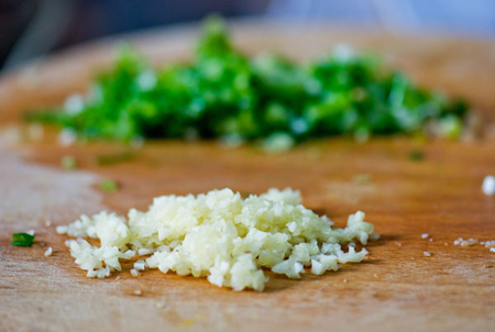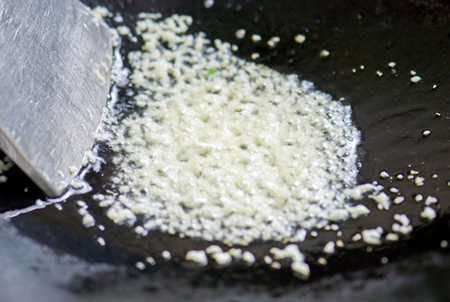 - Đun dầu ăn trong chảo ở nhiệt độ cao. Thêm tỏi vào xào cho đến khi thơ, đảo nhanh tay tránh cháy tỏi.