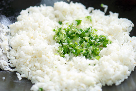 - Cho cơm vào khuấy mạnh, đảo liên tục cho đến khi cơm vào tỏi, dầu trộn đều với nhau. Đun lâu nhất là 1 phút. - Thêm hành tây thái nhỏ vào kèm theo nước tương và muối. Trộn đều và tắt bếp.
