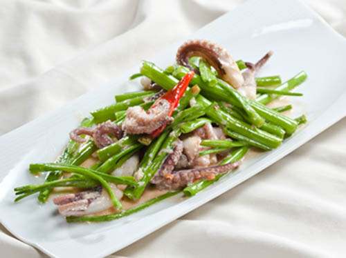 - Tiếp tục xào rau muống với 1M dầu ăn và hành tỏi băm, nêm 1/2 lượng xốt còn lại, chờ 3-4 phút cho rau muống thấm gia vị, cho bạch tuộc vào đảo đều, tắt bếp.