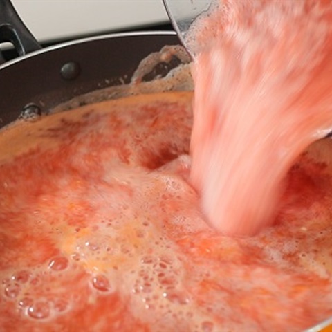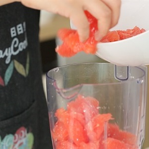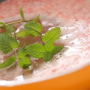 Cho bưởi vào máy ép trái cây, ép lấy nước, bỏ bã. Đổ 1/3 nước ép bưởi vào chảo, thêm lá bạc hà, nấu sôi 2 phút.