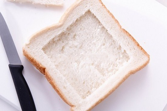 – Khoét phần ruột của 1 lá bánh sanhdwich, sau đó chồng lát bánh sandwich này lên lát bánh còn nguyên.