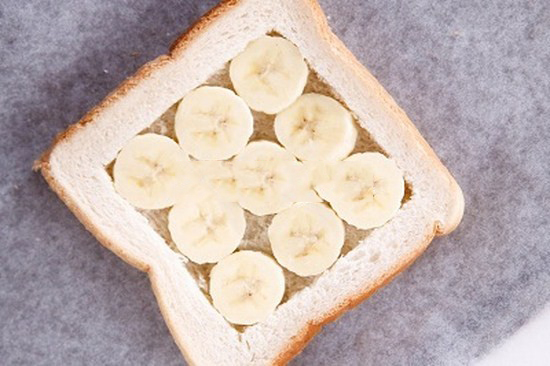 – Xếp các lát chuối vào kín hết lát bánh mì sandwich.