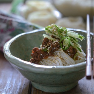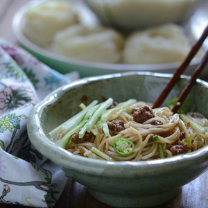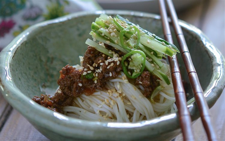 Gắp bún vào bát, rưới nước sốt bò băm lên trên. Thêm dưa chuột cắt sợi nhỏ, vài lát ớt xanh và mè rang là bạn đã hoàn thành món ăn rồi đó!