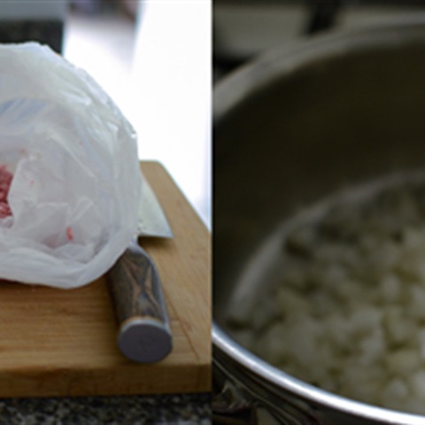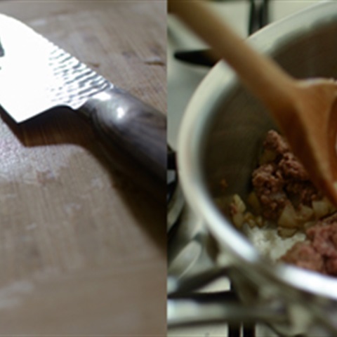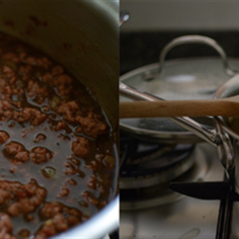 Thêm thịt bò băm vào chảo xào cùng hành tây và tỏi đến khi thịt bò chín và hơi chuyển màu vàng nâu.
