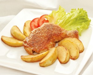 - Bày đùi tỏi gà và táo ra đĩa. Trang trí thêm xà lách, cà chua, dưa leo cho đẹp mắt nhé.