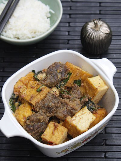 Với một chút biến tấu bạn đã có món đậu phụ kho bắp bò với bắp bò thấm gia vị, đậu phụ bùi bùi, điểm xuyến với mùi thơm của rau quế và patê gan.