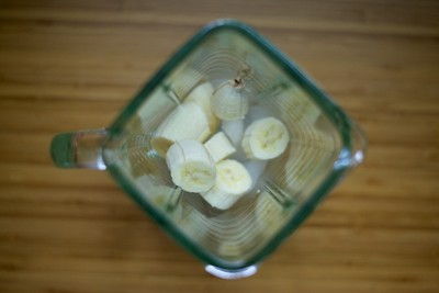 - Để thực hiện cách làm sinh tố chuối café, đầu tiên bạn cho chuối cùng đá viên vào máy xay sinh tố và xay nhuyễn.
