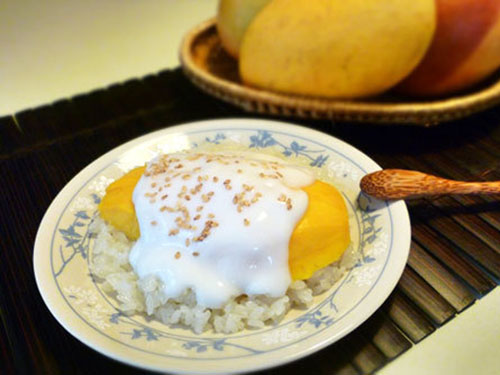 Từng miếng xoài ngọt lịm, ăn kèm với xôi trắng béo ngậy mùi nước cốt dừa và vị thơm của vừng rang vàng cho bạn một món tráng miệng kiểu Thái rất ngon.