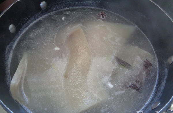 Bước 1 : Bì heo mua về bạn sử dụng dạo cạo để cạo hết phần bẩn trên da heo đi nhé. Bạn bắc một nồi nước sôi cùng với quế và hồi sau đó cho bì heo và chần qua khoảng 5 phút sau đó đem vớt ra rửa sạch lại bằng nước sạch nhé như thế bì heo sẽ được sạch hết bẩn và không có mùi hôi nhé sau đó bì heo ráo nước nhé
