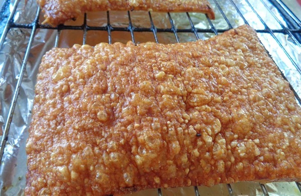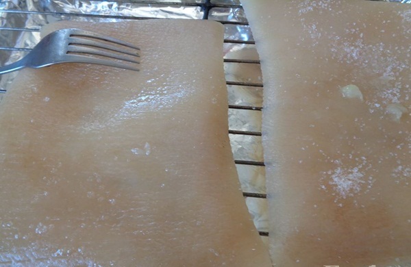 Bước 3 :Tiếp tục làm theo hướng dẫn làm bì heo nướng vàng giòn vụn ngon hấp dẫn.Sau đó bạn sử dụng lò nướn để lò nướng nóng ở nhiệt độ khoảng 220 độ C nhé. Sau đó cho bì heo lên trên vỉ và để trên khay cho bì heo vào nướng khoảng 45 phút là bì heo nổ vàng giòn vụn thì bạn đem tắt lò đi nhé