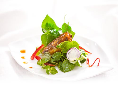 – Xếp rau càng cua trộn ra dĩa, cho cá mòi và ngò rí lên trên, trước khi ăn trộn đều.