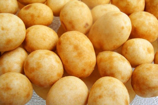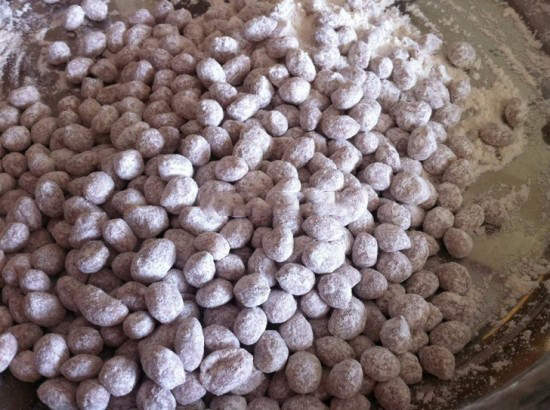 – Trộn bột với đậu phộng sao cho bột áo đều từng hạt đậu phộng. Sau đó lắc nhẹ cho phần bột áo thừa rơi ra ngoài.