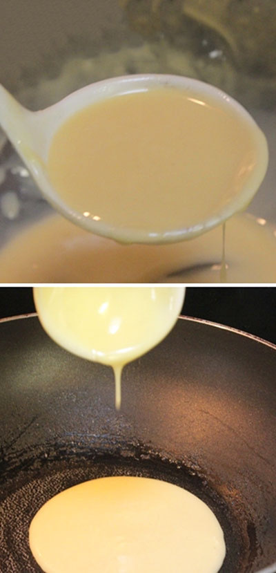 - Để lửa nhỏ, dùng muôi nhỏ, múc bột đổ từ trên cao vào chảo để bánh tròn đều, sau đó rán bánh với lửa vừa.