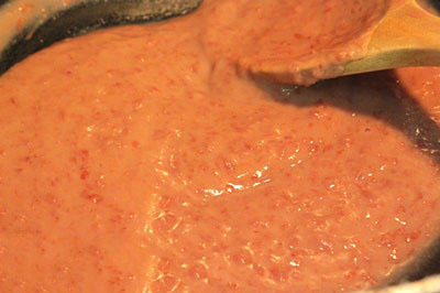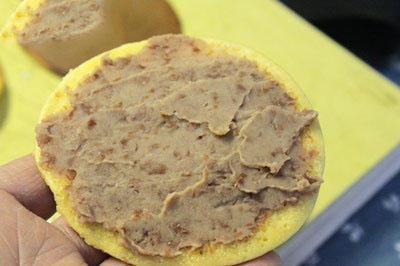 - Phết một lớp đậu đỏ lên bề mặt bánh.