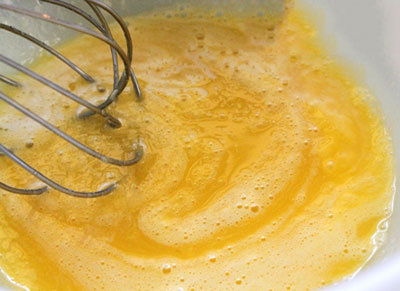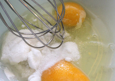 - Cho trứng vào âu lớn, thêm đường dùng dụng cụ đánh trứng cầm tay hay lấy 3 đôi đũa chụm lại, đánh tan đường.