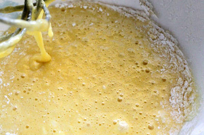 - Cho hỗn hợp bột ở bước 4 vào hỗn hợp trứng, trộn nhẹ.