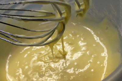 - Đổ thêm nước lọc vào âu hỗn hợp trứng, trộn đều đến khi đặc, dùng dụng cụ đánh trứng nhích bột lên chảy xuống thành từng dòng liên tục là được. Thêm ống vani vào, trộn đều. Tùy theo độ hút nước của mỗi loại bột mà điều chỉnh lượng nước cho phù hợp.