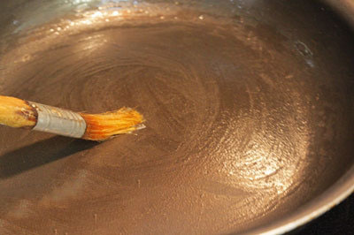 - Bật bếp, cho chảo chống dính lên bếp, chảo nóng thì bạn rưới một ít dầu ăn lên bề mặt chảo, sau đó dùng khăn giấy hay cọ phết, lau sơ phần dầu ăn để chỉ còn bám một lớp mỏng trên bề mặt chảo. Nếu nhiều dầu khi rán bánh sẽ không vàng đều.