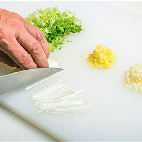 Cắt nhỏ tỏi, gừng và hành. Hành lá thì cắt chừa lại khoảng 5 cm phần màu trắng trong 2-3 cây lúc đầu, phần còn lại cắt nhỏ. Phần hành trắng được chừa lại lúc nãy đem thái sợi và bỏ vào nước.