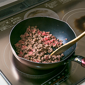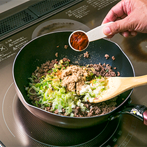Bắc chảo lên, để lửa vừa, bỏ 1 muỗng canh dầu mè vào. Sau đó bỏ thịt heo xay vào, khi thấy thịt chín thì bỏ tỏi, gừng và hành lá vào, tiếp theo là bỏ những gia vị được đánh dấu sao ở trên. Khi thấy rau chín thì tắt lửa.