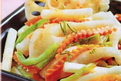- Củ sen gọt vỏ, ngâm với 1 thìa súp đường hòa tan với 2 thìa súp giấm khoảng 3 giờ, vớt ra thái lát.
