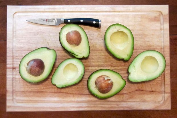 Để lấy hạt bơ ra, bạn dùng tay giữ nửa quả bơ có hạt, tay kia dùng dao chặt nhẹ vào hạt bơ, khẽ xoay dao sau đó nhấc ra.