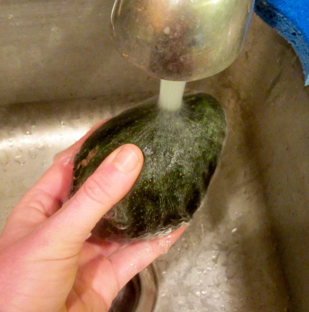 Rửa sạch vỏ bơ một cách nhẹ nhàng dưới nước ấm. Dù có muốn bảo quản bơ có vỏ hay không thì bạn cũng nên rửa sạch vỏ bơ nhé.