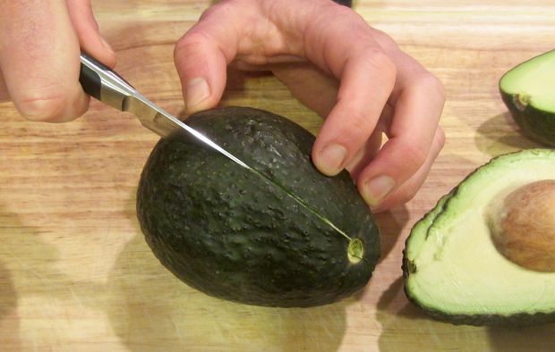 Bạn dùng một con dao sắc, cắt đôi quả bơ theo chiều dọc bằng cách xoay dao xung quanh quả bơ.