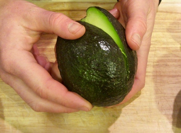 Sau khi đã cắt đôi quả bơ, bạn dùng 2 tay vặn 2 nửa quả bơ theo chiều ngược nhau để tách chúng ra.