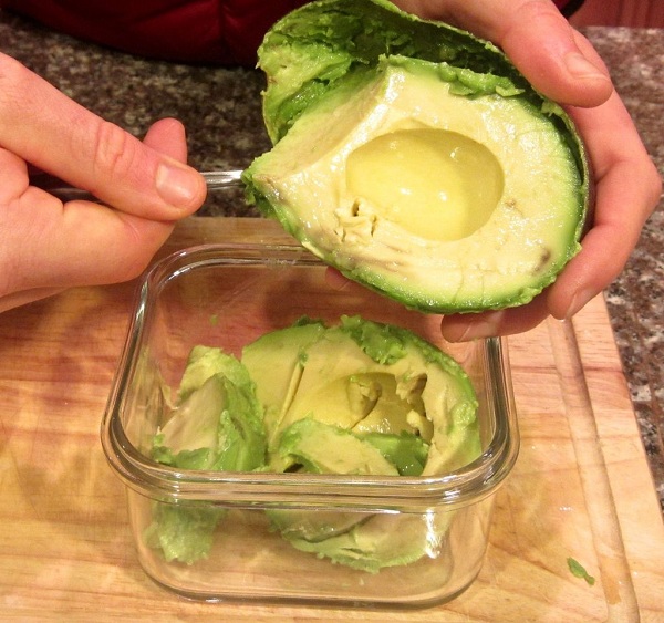 Với phương pháp bảo quản bơ trong ngăn đá thứ 2 này, bạn dùng một cái muỗng múc hết phần thịt của quả bơ vào một chiếc hộp.