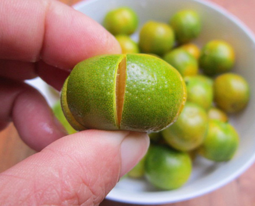 Bước 2:Dùng dao khứa đều quanh quả quất thành 4-5 hoặc 6 múi tùy quả to hay nhỏ.