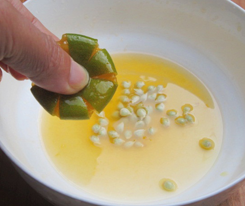 Bước 3: Dùng tay bóp bẹp quả quất, ấn nhẹ ở các múi quất để ép hạt và nước quất chảy ra. Nhớ dùng 1 chiếc bát to để đựng nước và hạt quất.