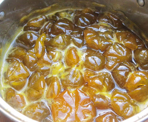 Bước 7:Cho nồi quất lên bếp, đun sôi rồi hạ lửa ở mức nhỏ. Thi thoảng cầm quai nồi nghiêng qua nghiêng lại cho đường chảy tràn lên mặt quất (không đảo quất vì sẽ làm quất bị nát). Khi nước rim quất cạn, những quả quất chuyển màu vàng trong óng ả thì tắt bếp.
