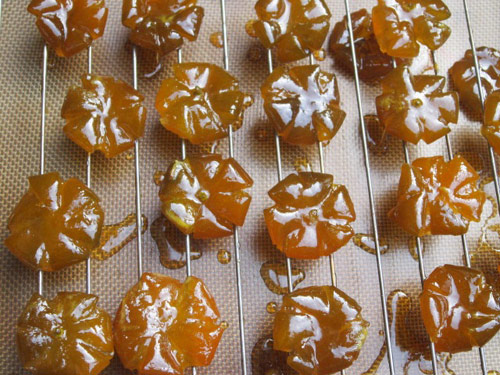 Bước 8:Gắp từng miếng mứt quất xếp lên giá, bên dưới có đặt khay hứng nước đường chảy từ mứt quất xuống. Đem mứt đi hong nắng cho đến lớp đường bao quanh mứt khô lại. Hoặc cho mứt vào hong trong tủ lạnh hoặc sấy bằng lò nướng với nhiệt độ khoảng 100 độ C cho đến khi mứt khô.