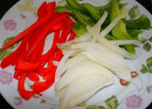 2. Ớt đỏ, xanh, hành tây rửa sạch, thái sợi.