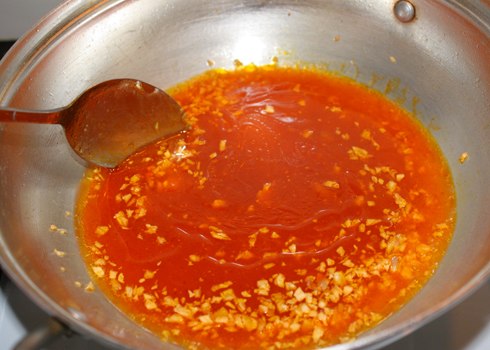3. Làm nóng chảo, phi thơm dầu với tỏi, cho hỗn hợp nước sốt vào đun nóng.