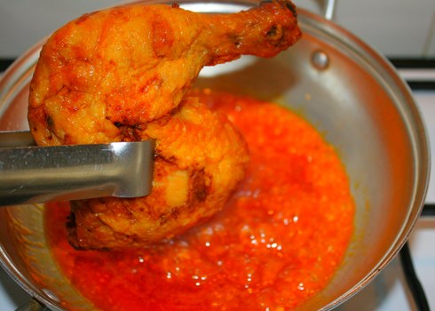 4. Cho đùi gà đã chiên vào khoảng 3 phút cho thấm gia vị rồi vớt ra đĩa.