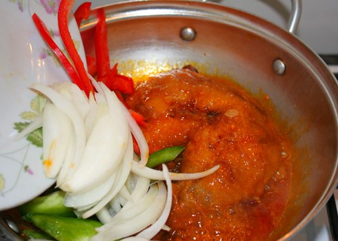 5. Tiếp đến cho hành tây và ớt chuông vào đảo chín rồi tắt bếp.