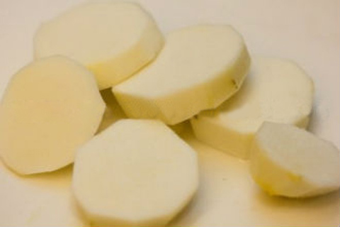 Gọt vỏ khoai sọ, rửa sạch rồi cắt thành từng khoanh dày khoảng 1cm.