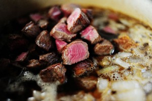 Bạn cho khoảng 50ml dầu oliu và bơ vào nồi đun nóng. Khi bơ tan bạn cho thịt bò vào đảo đều đến khi thịt chuyển sang màu nâu thì tắt bếp, múc thịt ra đĩa. Chờ cho thịt nguội bạn cắt đôi miếng thịt ra.