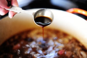 Tiếp tục bạn cho thịt bò vào nồi. Nêm 1 thìa cafe muối, 3 thìa canh sốt Woschestershire và 1 thìa canh đường, 1/2 thìa cafe tiêu vào. Đậy nắp, đun nhỏ lửa từ 1.5 đến 2 giờ cho thịt bò mềm và các gia vị quyện vào nhau.