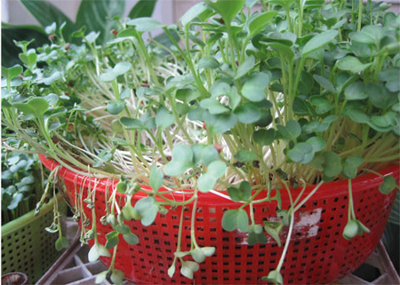Chỉ một ít hạt gieo trên cái rổ nhỏ, sau vài ngày là đã có rau để ăn.