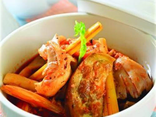 2. Xào thơm sả, cho cà chua vào xào cho lên màu. Cho đậu hũ, cà bát và nấm vào đảo sơ rồi châm nước dừa, nêm gia vị vào rim lửa nhỏ cho thấm đều. Om đến khi nước sền sệt là được.Cho ra thố dùng nóng với cơm.